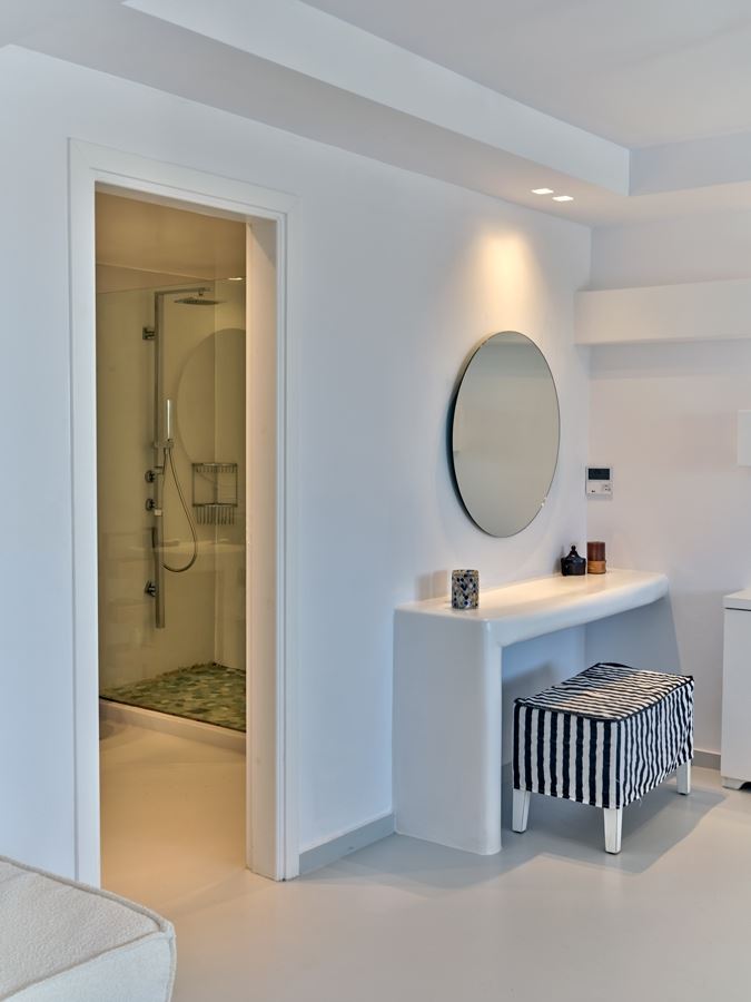 Οι εξωτερικοί χώροι είναι σχεδιασμένοι για χαλάρωση και ψυχαγωγία. Η ιδιωτική πισίνα 120 τ.μ., με ξαπλώστρες και ομπρέλες, προσφέρει τον απόλυτο χώρο για στιγμές ηρεμίας με θέα στη θάλασσα. Η σκιασμένη τραπεζαρία με μάρμαρο και BBQ δημιουργεί ιδανικό σκηνικό για πρωινά ή αξέχαστα δείπνα δίπλα στην πισίνα, προσφέροντας μοναδικές εμπειρίες.