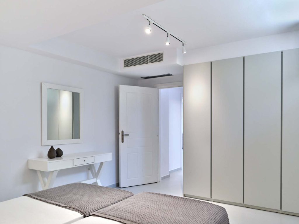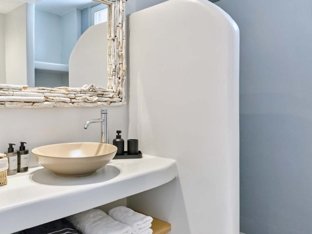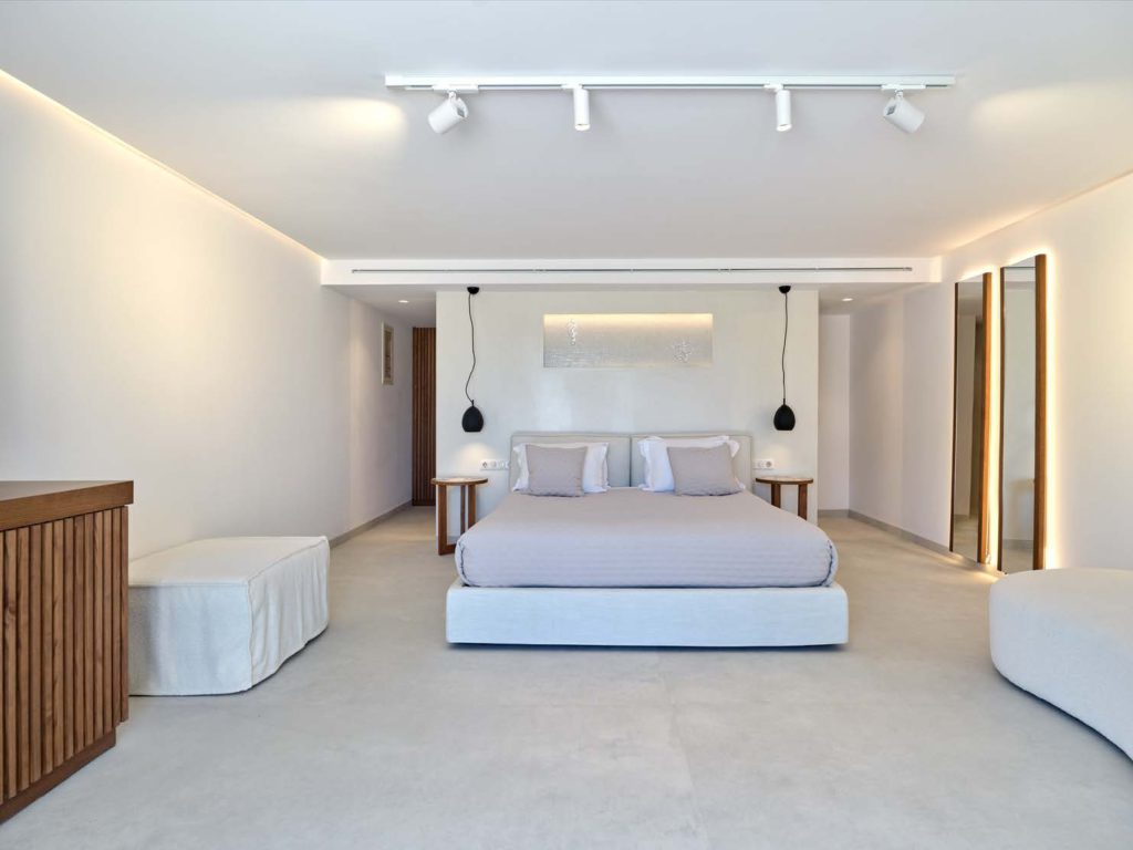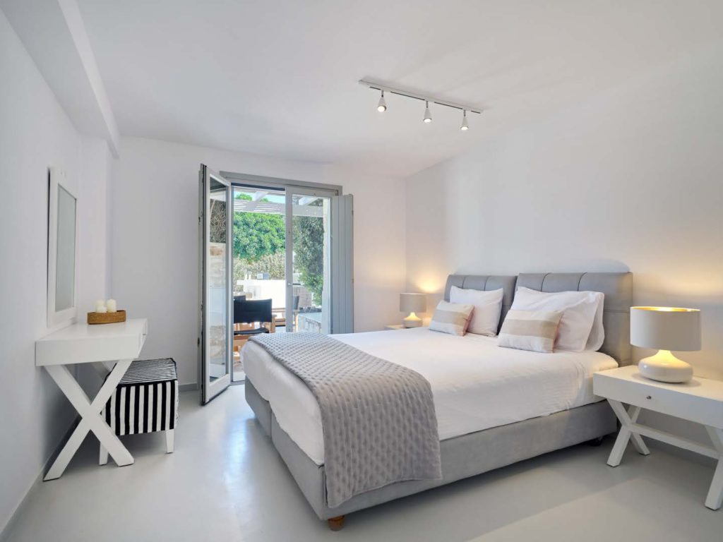 Στο εσωτερικό, η βίλα συνδυάζει παραδοσιακή κυκλαδίτικη αρχιτεκτονική με σύγχρονες ανέσεις. Οι ενιαίοι χώροι καθιστικού γεμίζουν με φυσικό φως, αναδεικνύοντας κομψή επίπλωση και δημιουργώντας ζεστή, φιλόξενη ατμόσφαιρα. Τα ευρύχωρα υπνοδωμάτια ιδιωτικά λουτρά προσφέρουν άνεση και απόλυτη ιδιωτικότητα για τους ιδιοκτήτες και τους επισκέπτες.