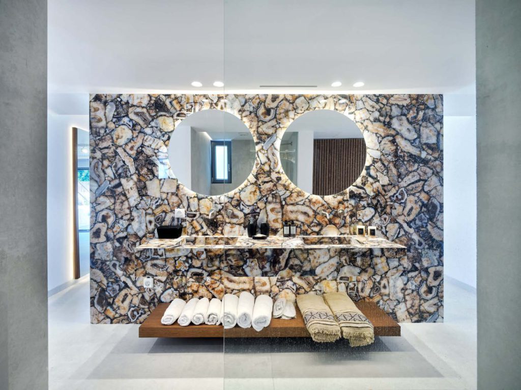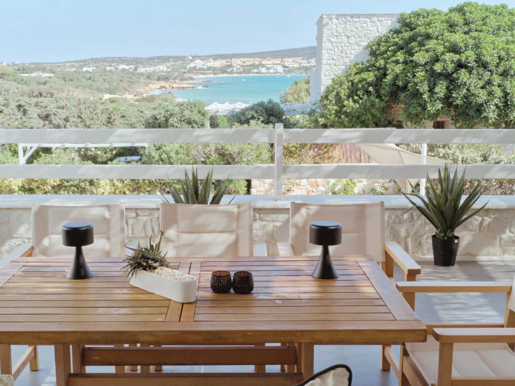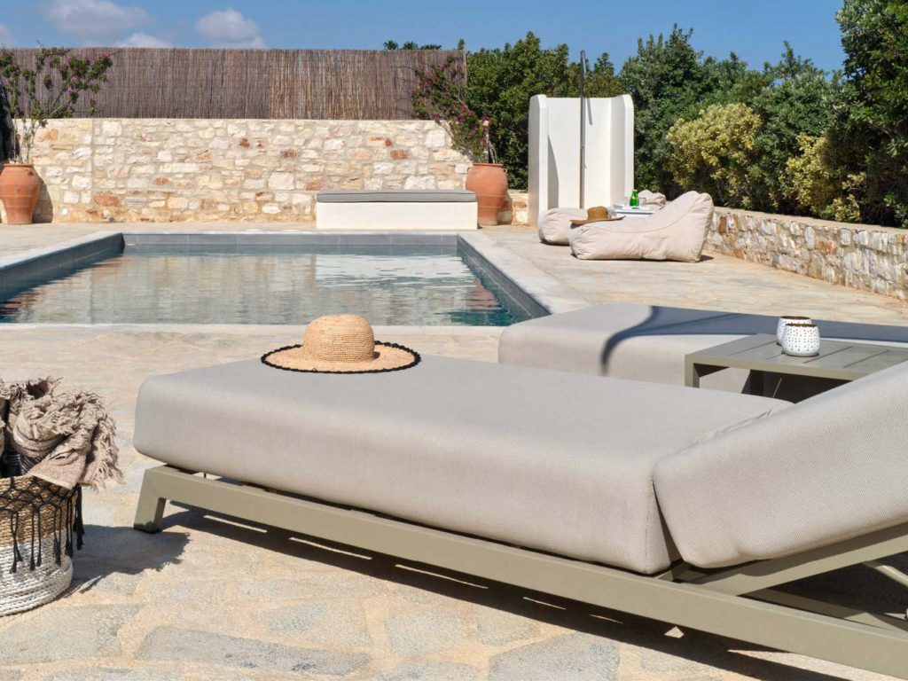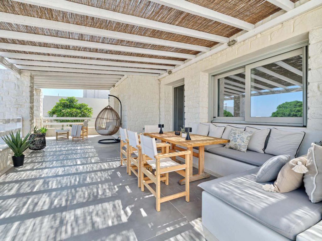Οι εξωτερικοί χώροι είναι σχεδιασμένοι για απόλυτη χαλάρωση και ψυχαγωγία. Η ιδιωτική πισίνα και η ευρύχωρη βεράντα με τραπεζαρία προσφέρουν το ιδανικό σκηνικό για υπαίθρια γεύματα και στιγμές ηρεμίας, ενώ η θέα στο πέλαγος δημιουργεί μαγευτικές εμπειρίες καθημερινά. Ταυτόχρονα, η χρήση οικολογικών και υψηλής ποιότητας υλικών εξασφαλίζει βιώσιμη και πολυτελή διαβίωση.
