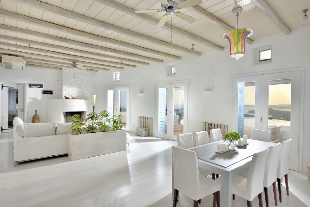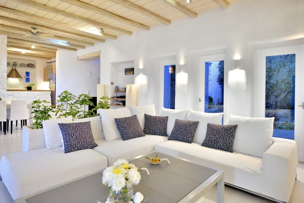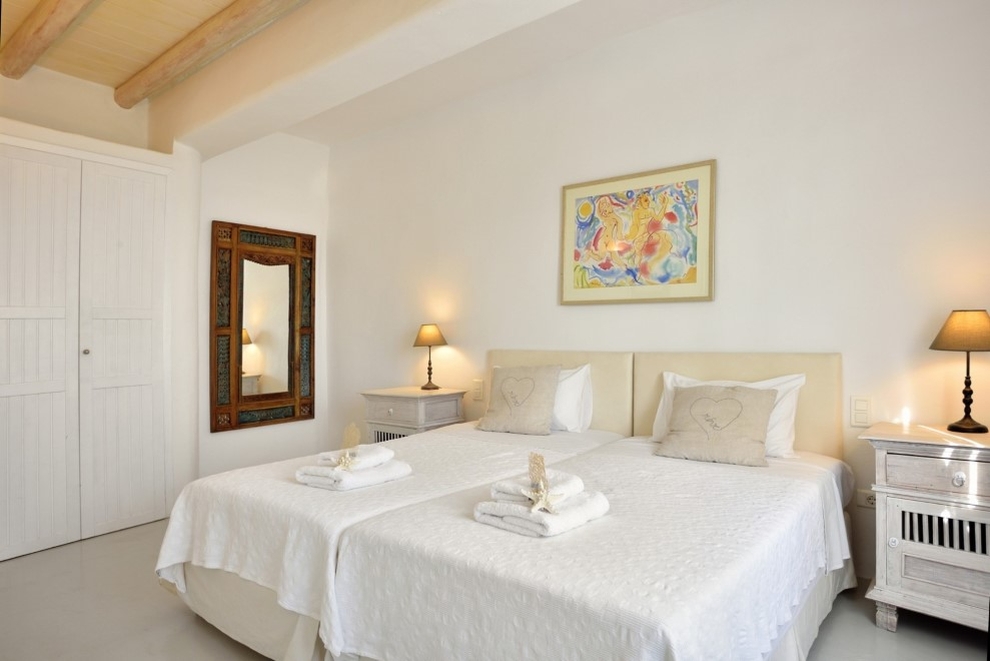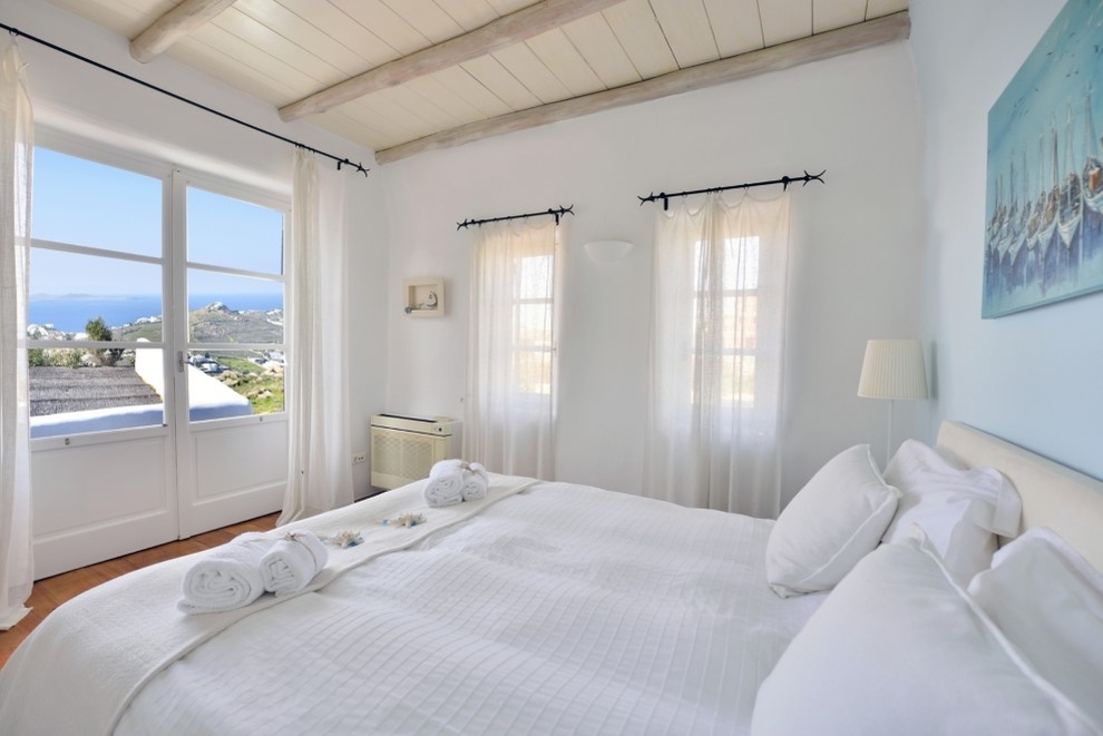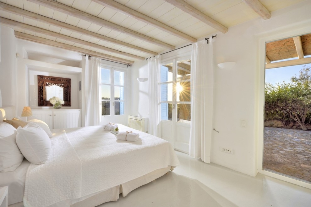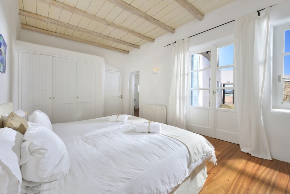 Οι εσωτερικού χώροι του ακινήτου έχουν άνετο καθιστικό με τραπεζαρία και κουζίνα με όλο το πλήρη εξοπλισμό. Το ακίνητο έχει έξι ευρύχωρα και φωτεινά υπνοδωμάτια. Τα τρία είναι στην κύρια κατοικία, ενώ τα άλλα τρία είναι ανεξάρτητα υπνοδωμάτια. Το ύφος του ακινήτου συνδιάζει την κλασσική αρχιτεκτονική του νησιού με μοντέρνες πινελιές.