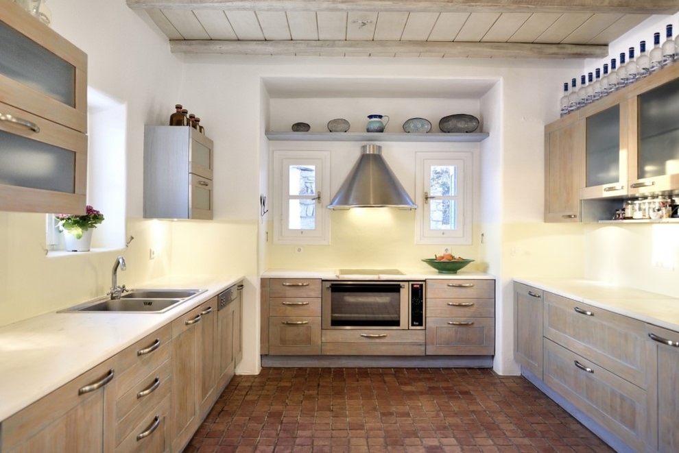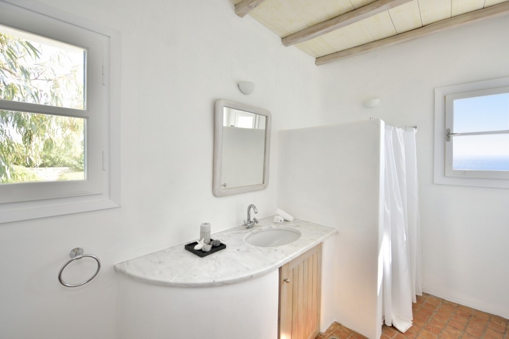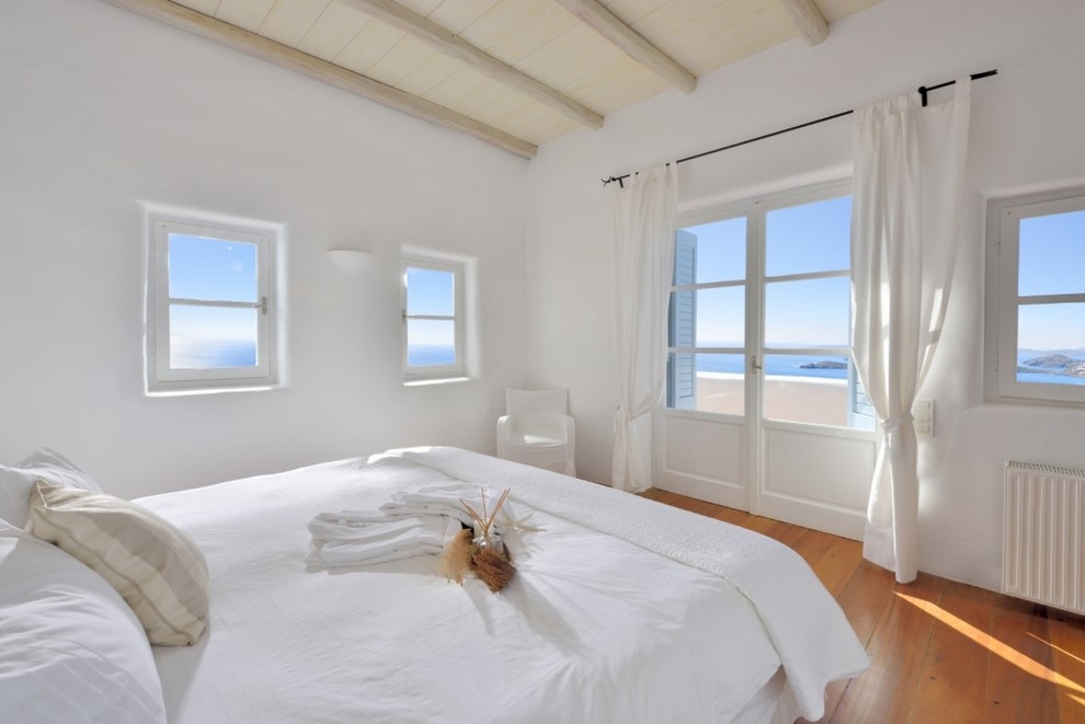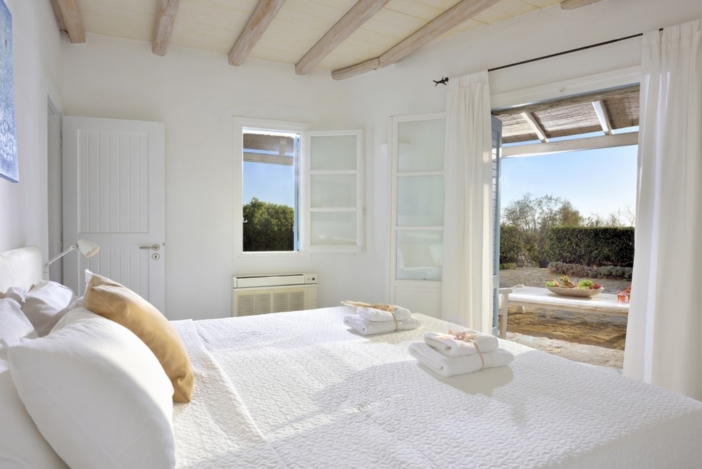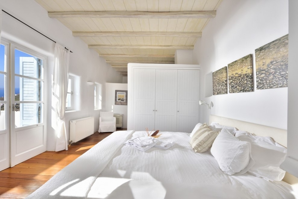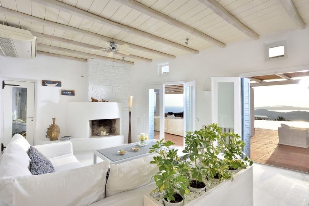 Οι εσωτερικού χώροι του ακινήτου έχουν άνετο καθιστικό με τραπεζαρία και κουζίνα με όλο το πλήρη εξοπλισμό. Το ακίνητο έχει έξι ευρύχωρα και φωτεινά υπνοδωμάτια. Τα τρία είναι στην κύρια κατοικία, ενώ τα άλλα τρία είναι ανεξάρτητα υπνοδωμάτια. Το ύφος του ακινήτου συνδιάζει την κλασσική αρχιτεκτονική του νησιού με μοντέρνες πινελιές.