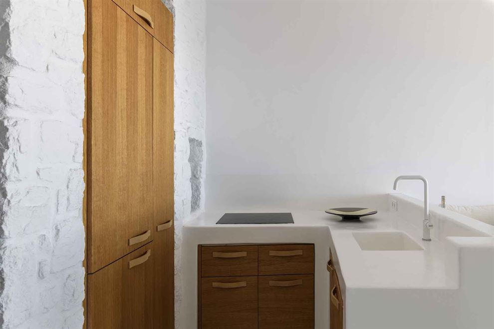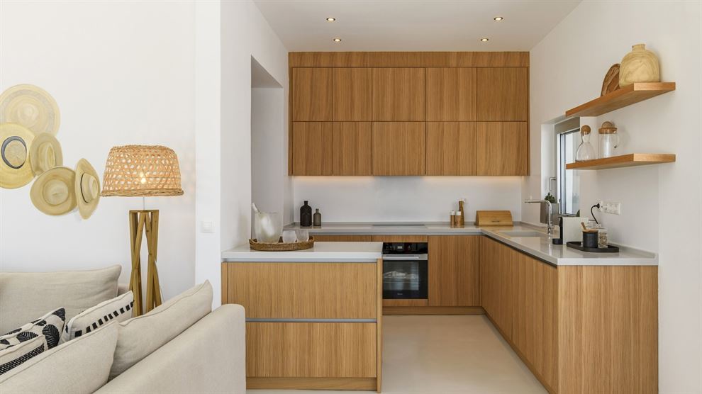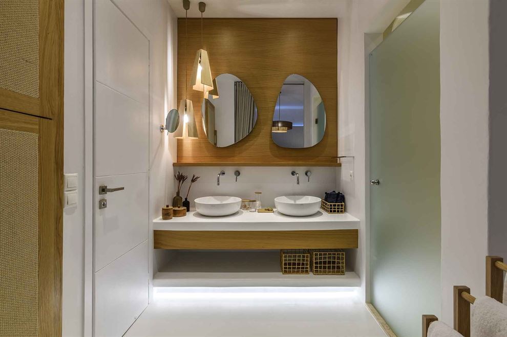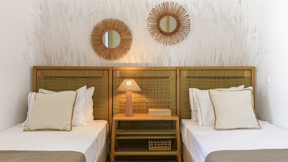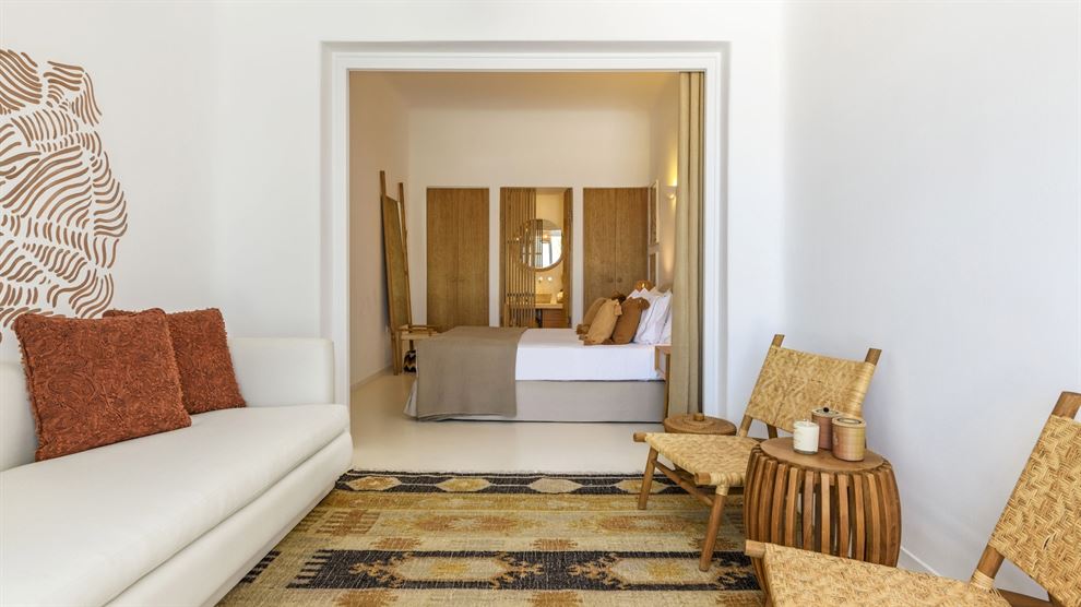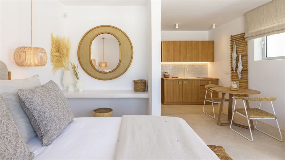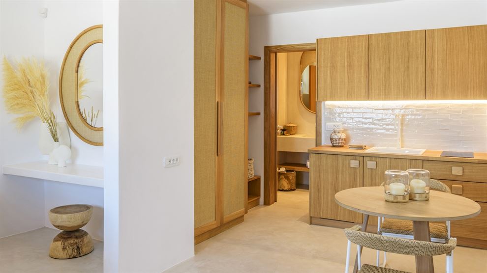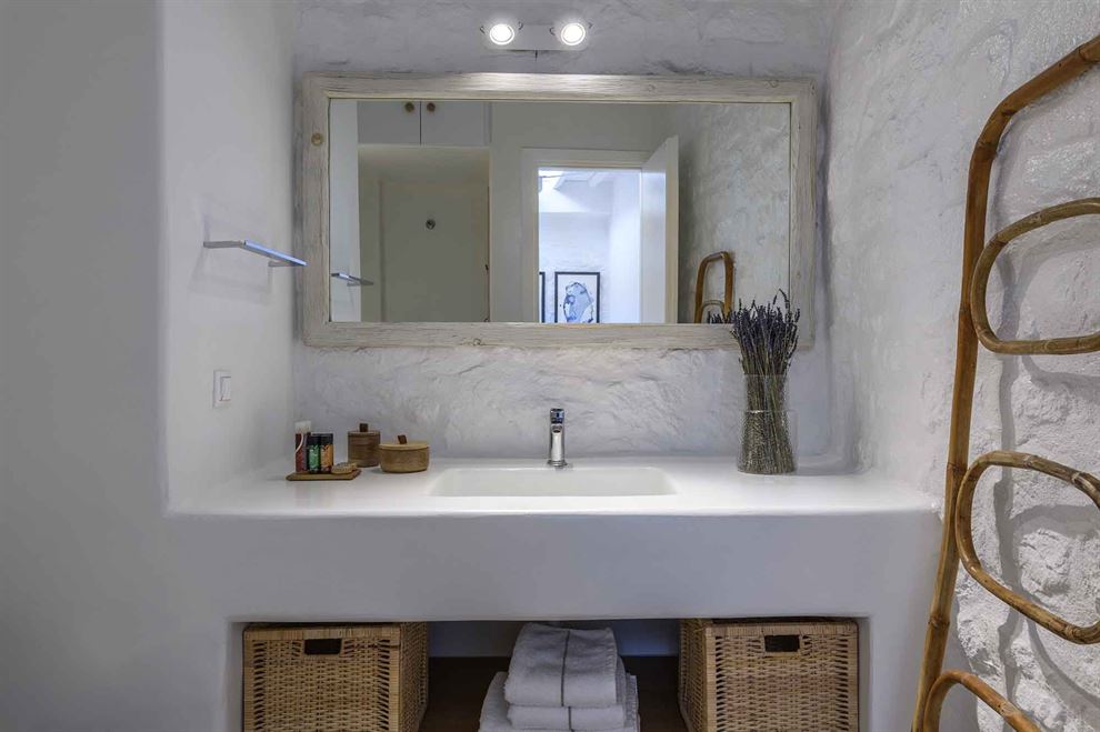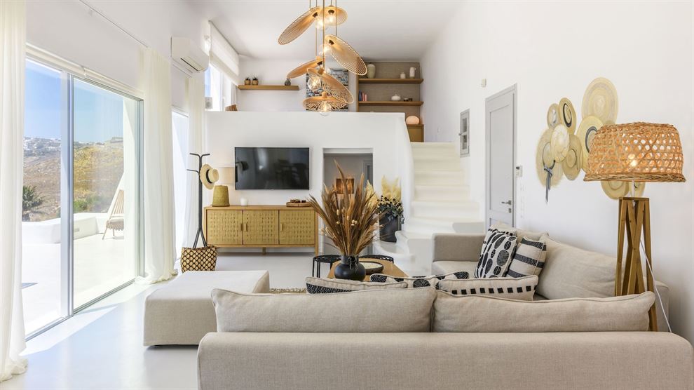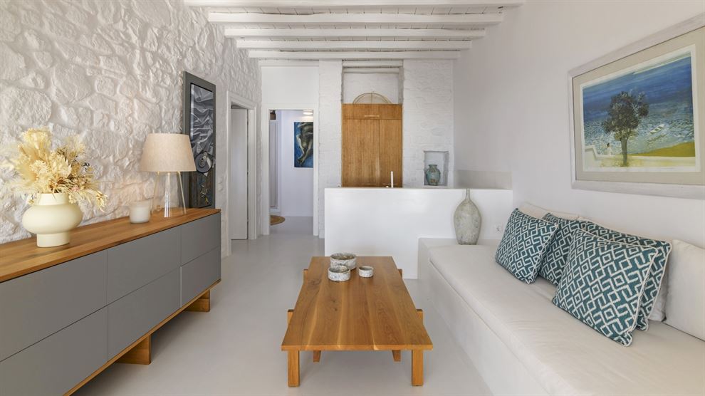 Στο εσωτερικό, η βίλα παρουσιάζει μια σύγχρονη αισθητική με υψηλής ποιότητας έπιπλα και επιλεγμένα έργα τέχνης. Ο σχεδιασμός εστιάζει στην αρμονία του λευκού με το ξύλο, δημιουργώντας έναν κομψό και φιλόξενο χώρο. Η βίλα περιλαμβάνει το κύριο σπίτι και δύο ξενώνες, εξασφαλίζοντας πλήρη ιδιωτικότητα. Με 8 υπνοδωμάτια, φιλοξενεί άνετα έως και 15 άτομα.