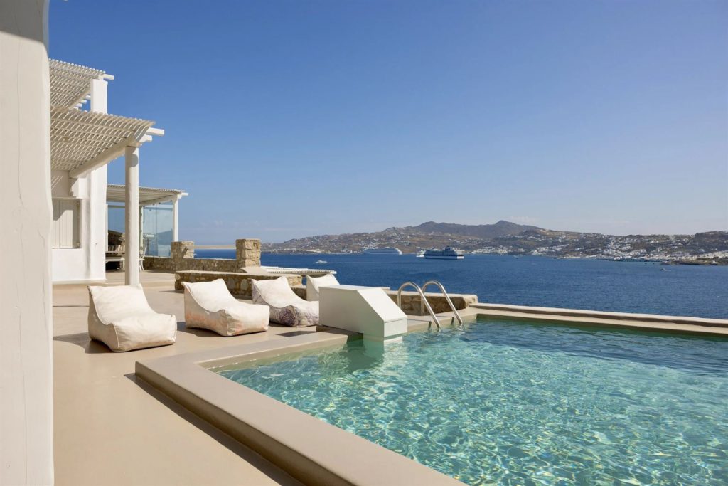 Η κύρια infinity πισίνα προσφέρει ένα ήρεμο καταφύγιο, ενώ οι ευρύχωρες βεράντες απολαμβάνουν πανοραμική θέα στη θάλασσα, δημιουργώντας το ιδανικό περιβάλλον για χαλάρωση μετά από μια μέρα εξερεύνησης του νησιού.