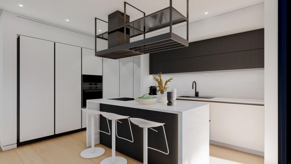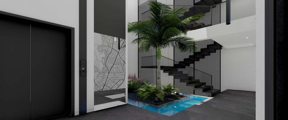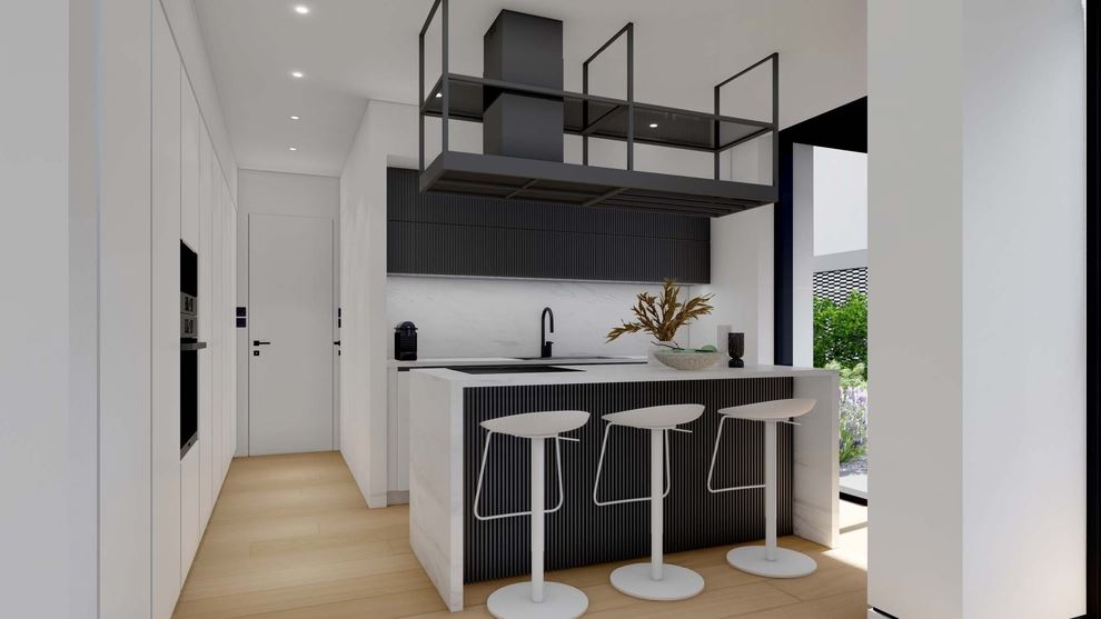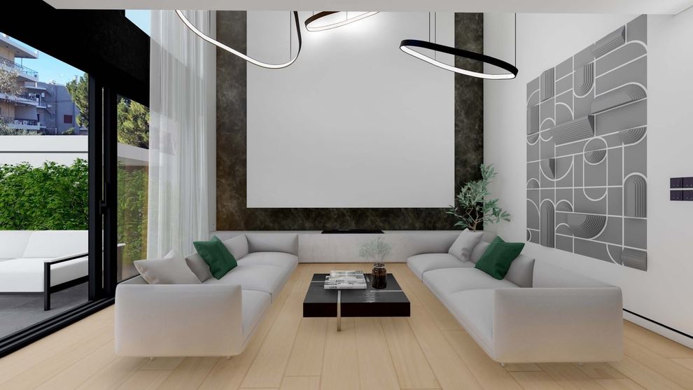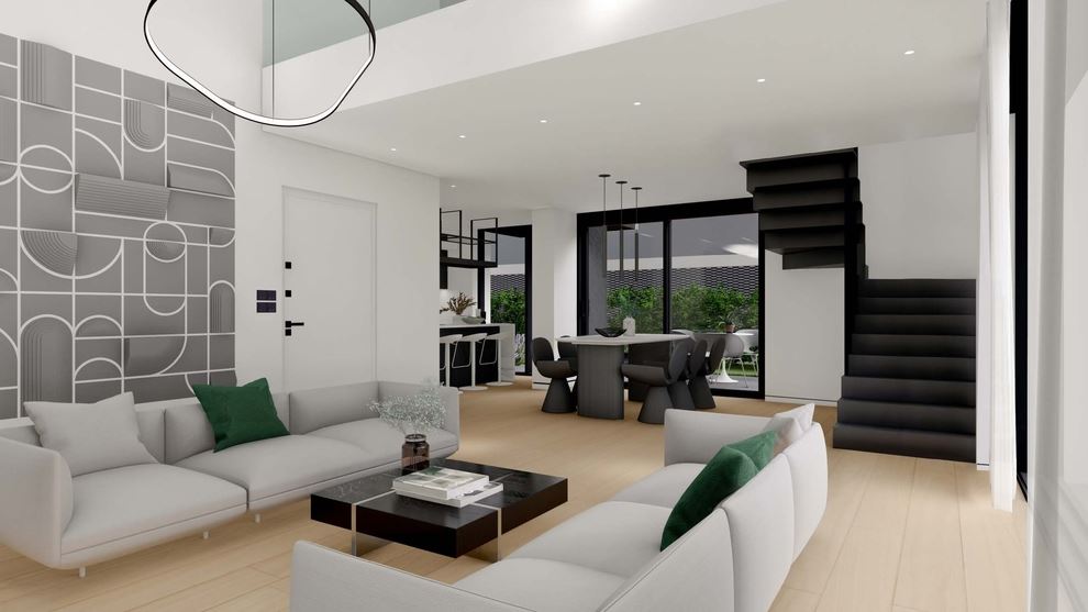 Στο ισόγειο (86 τ.μ.) είναι ο ενιαίος χώρος καθιστικού και κουζίνας με διπλό ύψος και ενεργειακό τζάκι. Η έξοδος στον ιδιωτικό κήπο 151 τ.μ. με πισίνα 30 τ.μ. δημιουργεί μια ιδανική συνέχεια μεταξύ εσωτερικού και εξωτερικού χώρου. Ο πρώτος όροφος (69 τ.μ.) περιλαμβάνει τρία υπνοδωμάτια. Το ένα είναι master με δικό του μπάνιο, ενώ υπάρχει και δεύτερο μπάνιο για τα υπόλοιπα δωμάτια. Ένας επιπλέον ανοιχτός χώρος μπορεί να λειτουργήσει ως γραφείο ή καθιστικό.