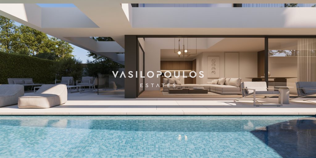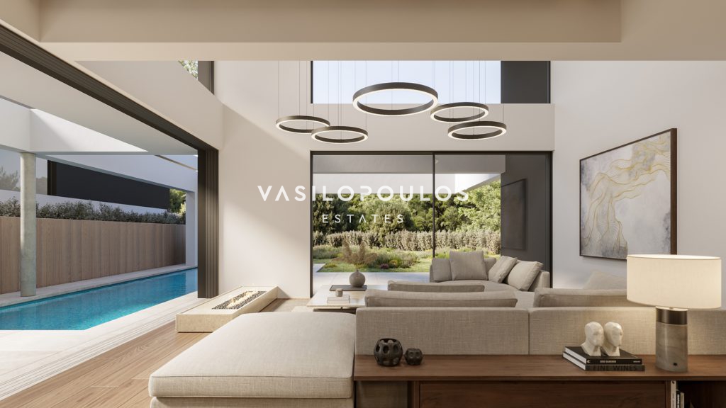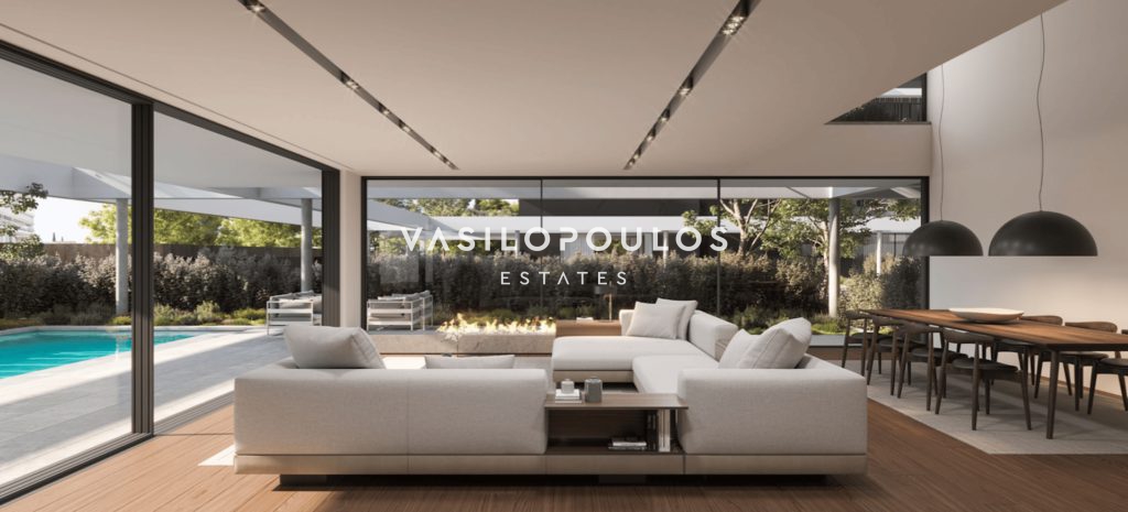 Η μοναδική αυτή κατοικία καλύπτει 3 ορόφους (υπόγειο, ισόγειο, και 1ο όροφο) του κτιρίου. Τα μοντέρνα υλικά και τα εξαιρετικά φινιρίσματα προσδίδουν στο ακίνητο μια πολυτελή και σύγχρονη αισθητική. Το ισόγειο αποτελεί τον κύριο χώρο υποδοχής. Ο μεγάλος ανοιχτός χώρος περιλαμβάνει το σαλόνι, την τραπεζαρία, την κουζίνα και το wc επισκεπτών. Ιδιαίτερη πινελιά στη διακόσμηση προσδίδει το τζάκι από γυαλί με συμπαγής βάση και πλήρες γυάλινο κάλυμμα. Έργα τέχνης, μοντέρνα και εντυπωσιακά φωτιστικά και φυτά έχουν προσθέσει αισθητική αξία ζεστασιά και στιλ. Το φωτεινό φυσικό φως εισέρχεται μέσα από τα μεγάλα παράθυρα και προσφέρει υπέροχη θέα στον κήπο και την πισίνα.
