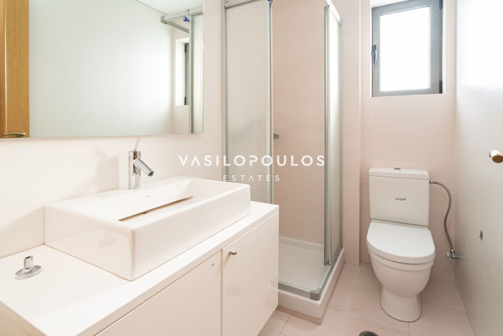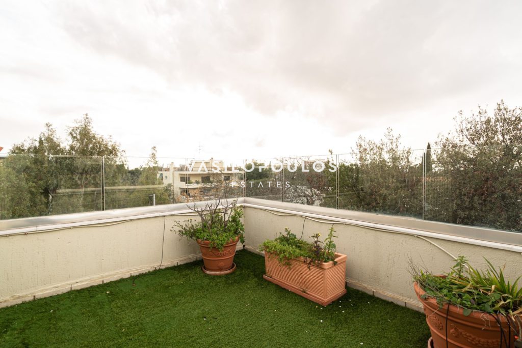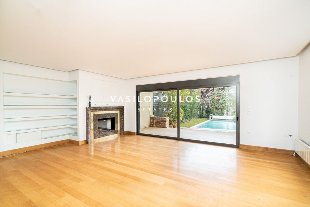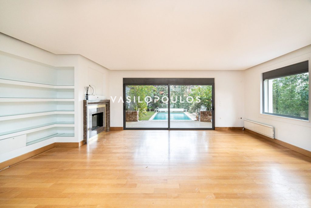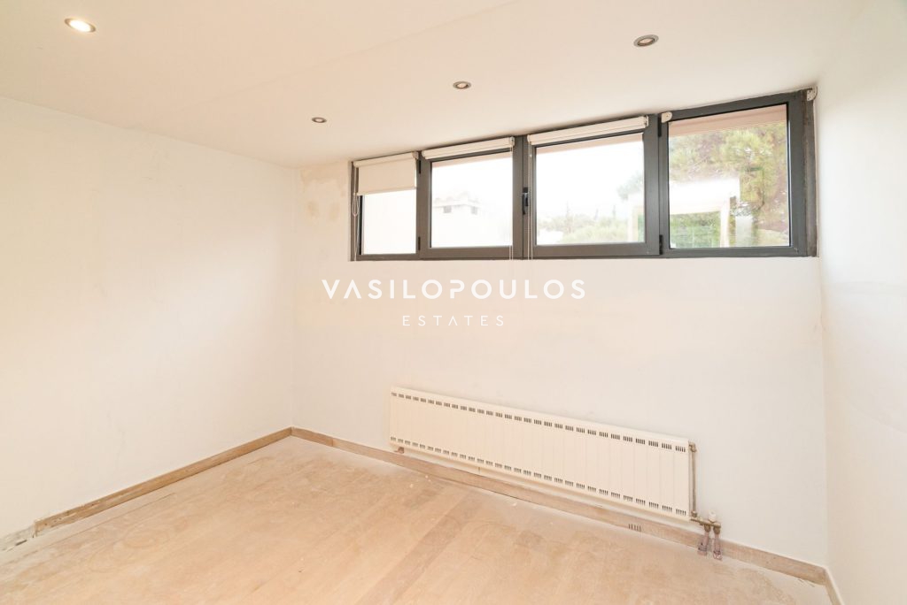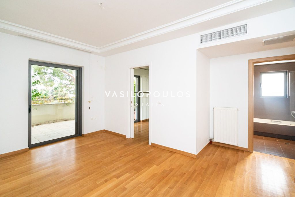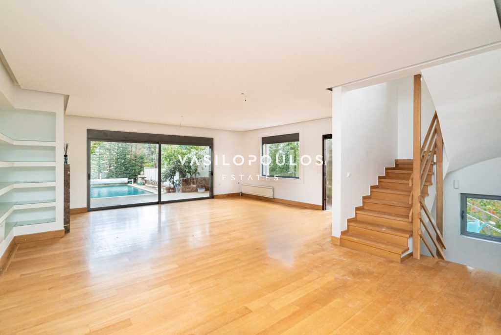 Το ισόγειο περιλαμβάνει σαλόνι με τζάκι και δρύινα πατώματα, ενιαία τραπεζαρία και μοντέρνα κουζίνα υψηλής αισθητικής, ενώ υπάρχει και WC επισκεπτών. Στον πρώτο όροφο βρίσκονται τρία master υπνοδωμάτια, με έξυπνη διαρρύθμιση και άπλετο φυσικό φως. Ο δεύτερος όροφος φιλοξενεί ένα υπνοδωμάτιο, μπάνιο, έναν επιπλέον χώρο που μπορεί να χρησιμοποιηθεί σαν γραφείο και μεγάλη βεράντα με ανεμπόδιστη θέα. Ακόμα, υπάρχει υποδομή για τζακούζι.