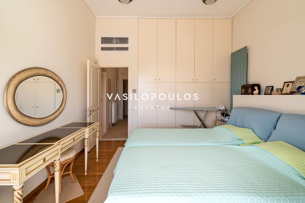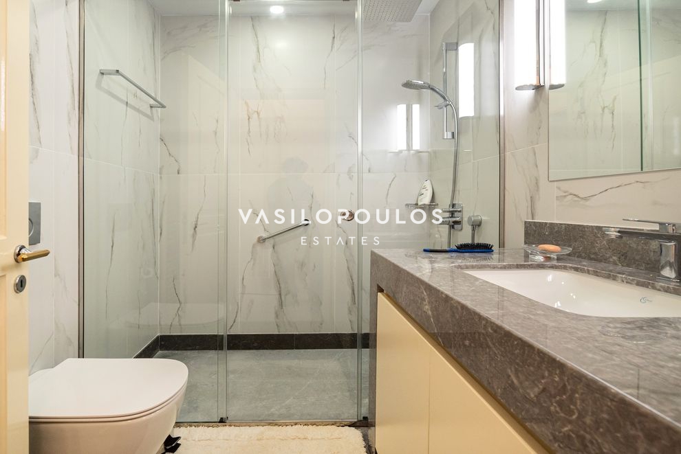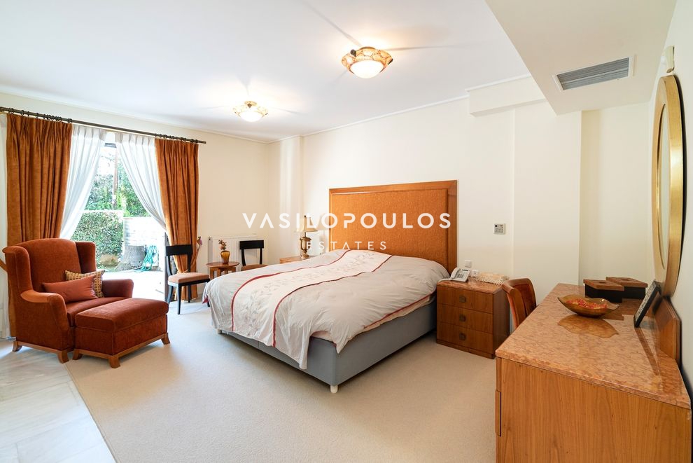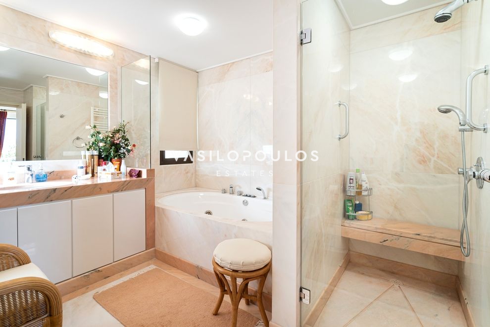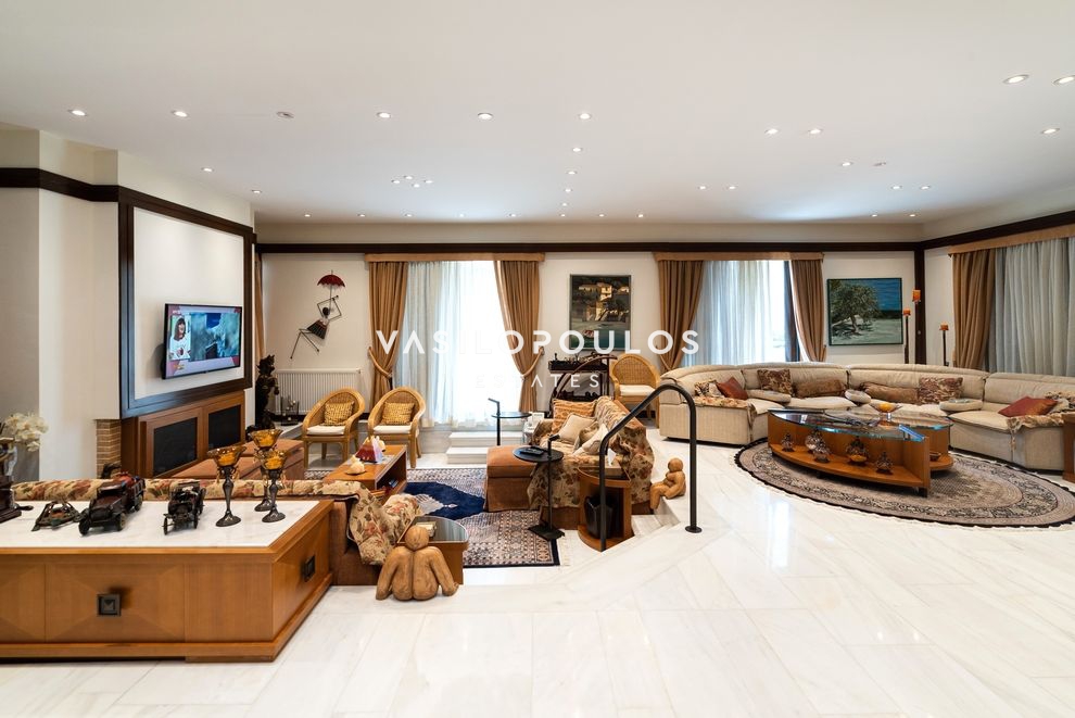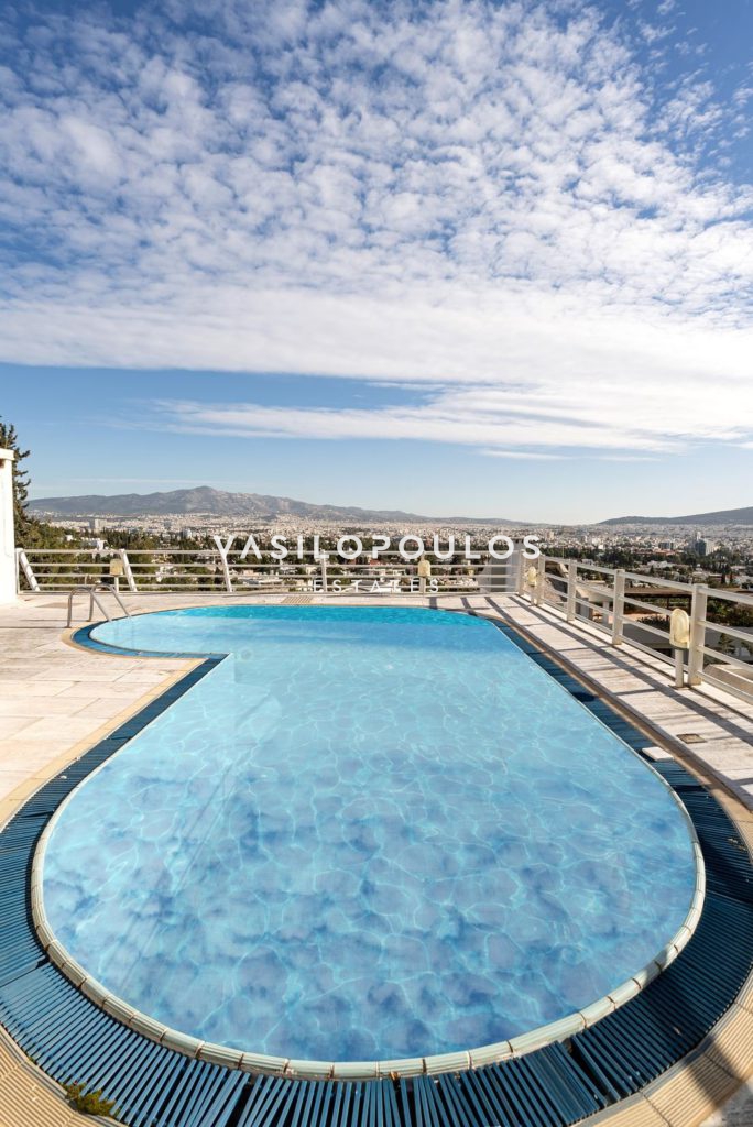 Το κατώτερο επίπεδο, με ανεξάρτητη είσοδο, διαθέτει καθιστικό με τζάκι και δεύτερη κουζίνα. Στο ίδιο επίπεδο υπάρχει en suite υπνοδωμάτιο με πρόσβαση σε βεράντα, δωμάτιο υπηρεσίας, WC με ξεχωριστό ντους και αποθηκευτικός χώρος. Στην ταράτσα του ακινήτου βρίσκεται πισίνα με ανοιχτή θέα, ενώ στο υπόγειο υπάρχει κλειστή θέση στάθμευσης.