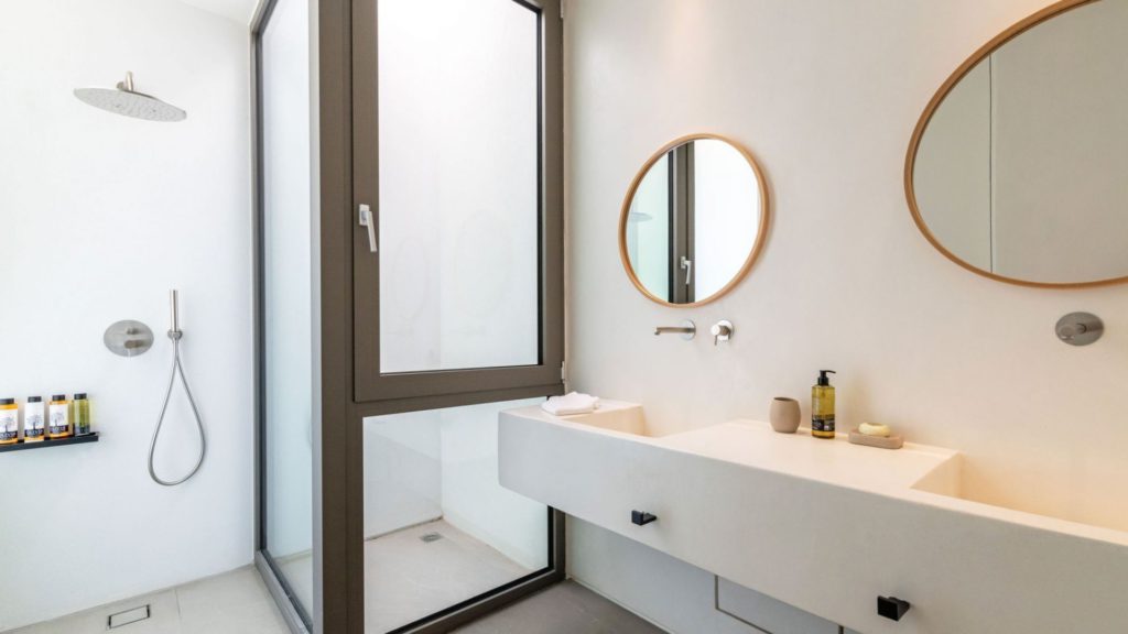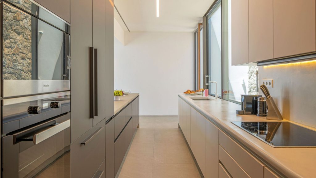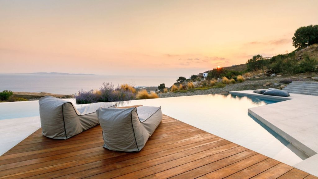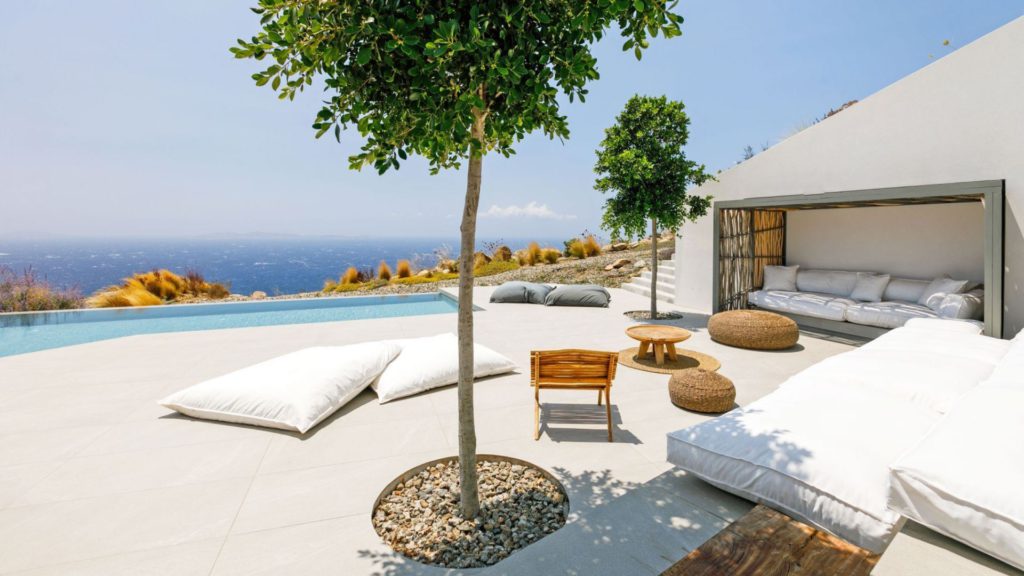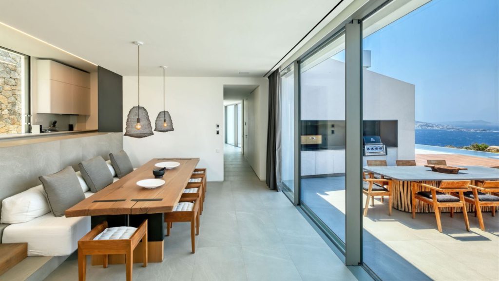 Η infinity πισίνα ξεχωρίζει, δημιουργώντας την ψευδαίσθηση ότι ενώνεται με τη θάλασσα, ενώ οι γήινες αποχρώσεις των εξωτερικών χώρων προσθέτουν κομψότητα. Η σκιασμένη τραπεζαρία και το lounge στον κήπο προσφέρουν ιδανικό περιβάλλον για στιγμές χαλάρωσης ή αξέχαστα γεύματα με θέα στη θάλασσα.