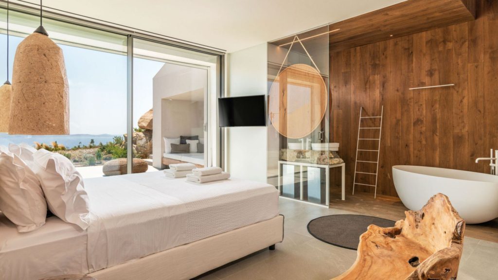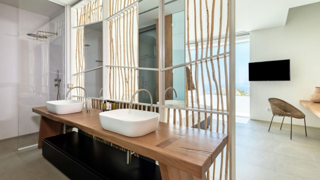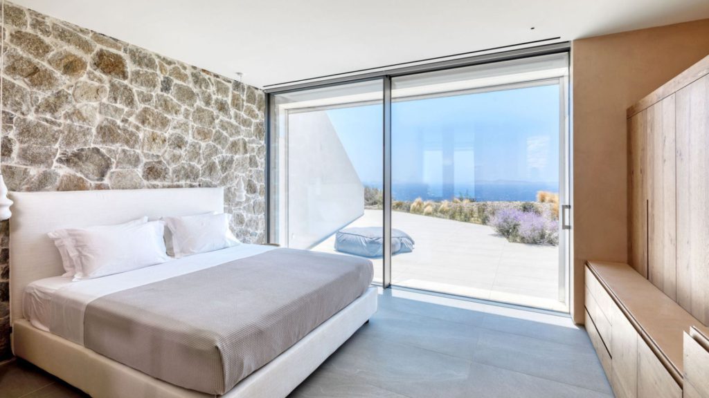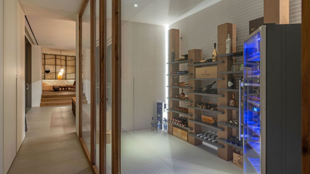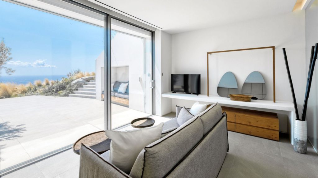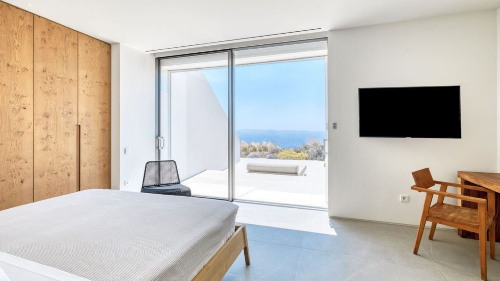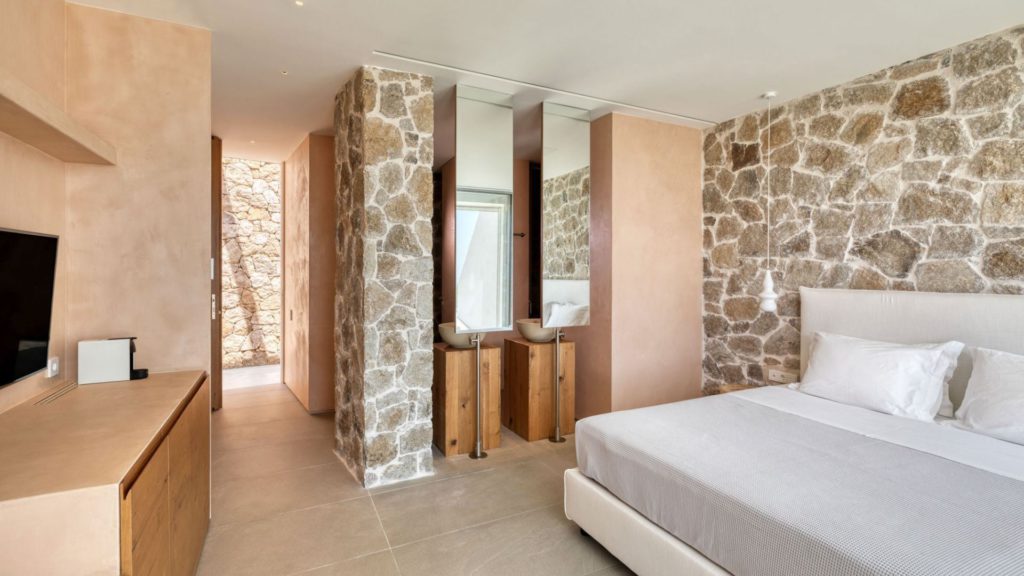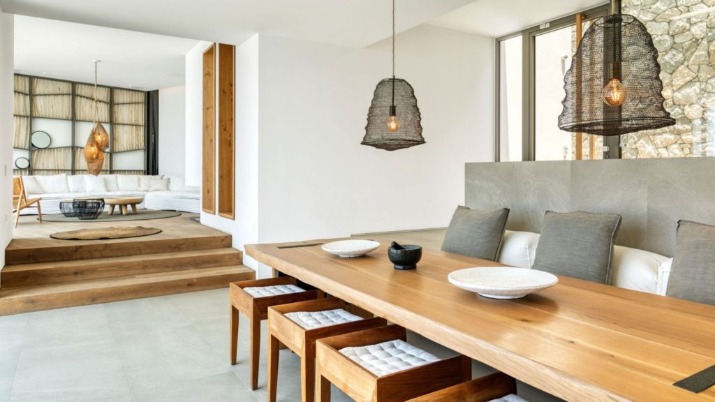 Στο εσωτερικό, η βίλα ακολουθεί μινιμαλιστική αισθητική με μοντέρνες λεπτομέρειες και ξύλινη επίπλωση, ενώ οι πολυεπίπεδοι χώροι προσφέρουν αίσθηση ευρυχωρίας. Η κατοικία διαθέτει 6 υπνοδωμάτια με ιδιωτικά μπάνια, όλα με άνετα διπλά κρεβάτια και κομψές ξύλινες λεπτομέρειες, και πολλαπλούς χώρους καθιστικού για χαλάρωση και ψυχαγωγία.