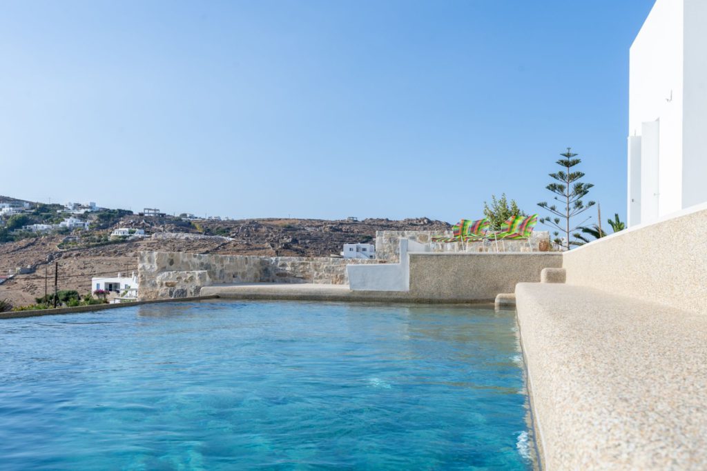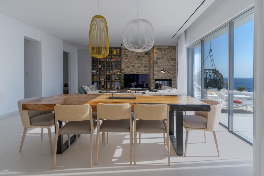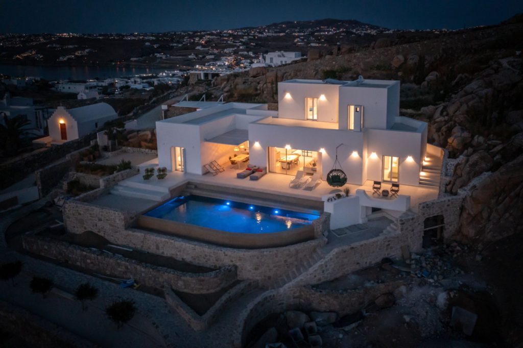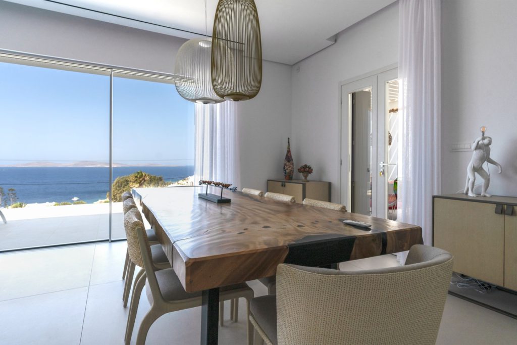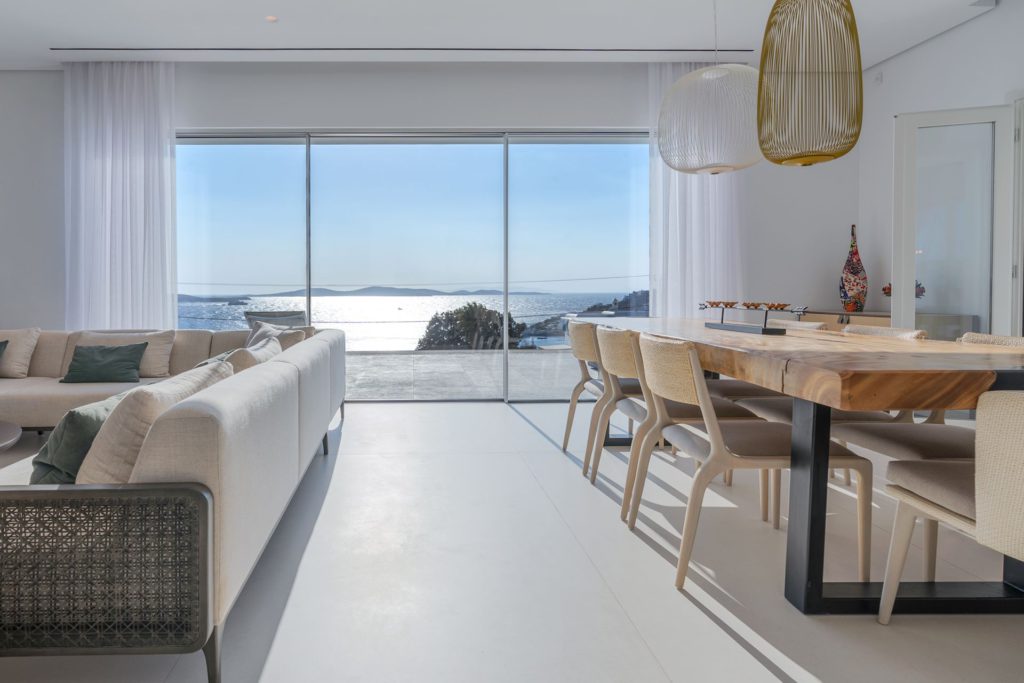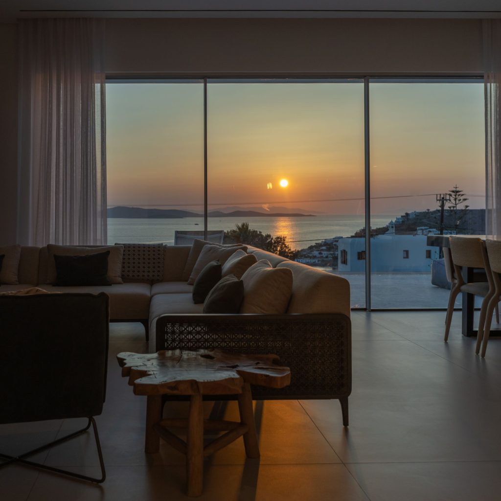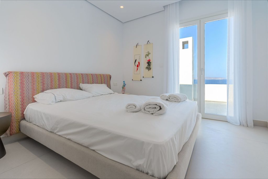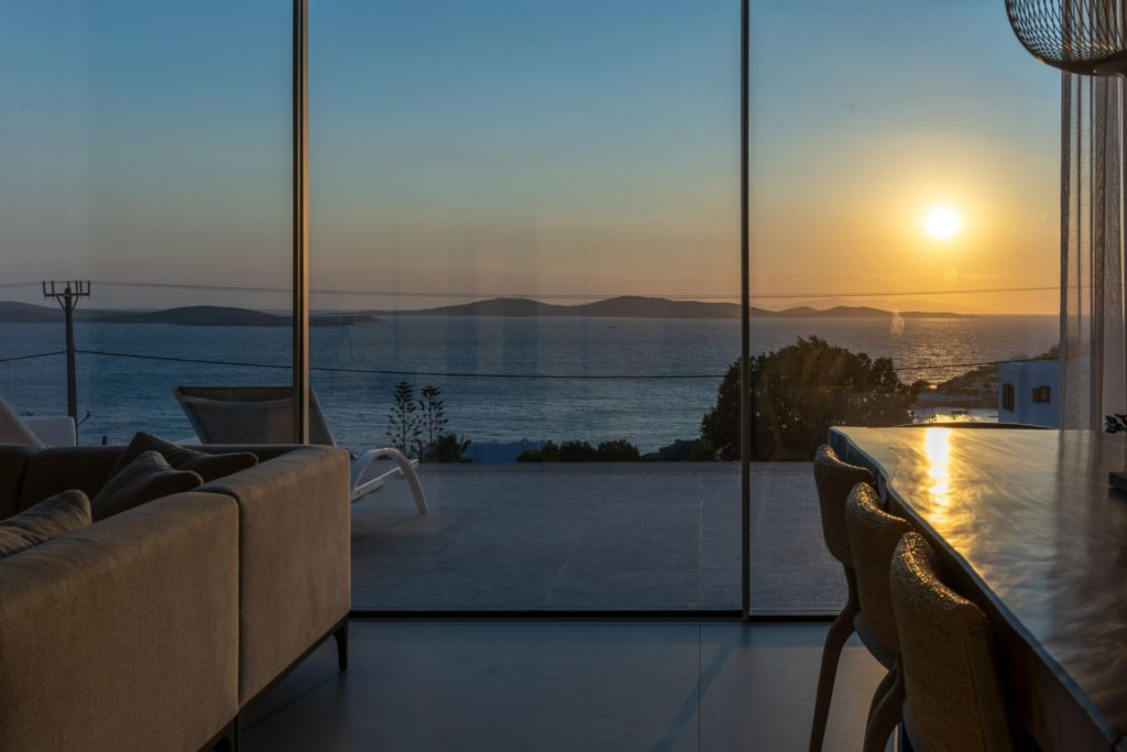 Το οικόπεδο των 5.000 τ.μ. φιλοξενεί μια εντυπωσιακή infinity πισίνα, άνετες ξαπλώστρες, καθιστικά και μια τραπεζαρία κάτω από ξύλινη πέργκολα, ιδανικά για γεύματα, κοκτέιλ ή στιγμές ηρεμίας με θέα το ηλιοβασίλεμα. Ο minimal σχεδιασμός προσδίδει κομψότητα και ηρεμία, ενώ οι εξωτερικοί χώροι συνδυάζουν λειτουργικότητα και αισθητική υψηλού επιπέδου.Στο εσωτερικό, οι λευκές και φωτεινές επιφάνειες δημιουργούν ζεστή και φιλόξενη ατμόσφαιρα, ενώ οι προσεκτικά επιλεγμένες επίπλωσεις συνδυάζουν μοντέρνα αισθητική με πολυτέλεια. Τα πέντε υπνοδωμάτια με ιδιωτικά μπάνια προσφέρουν άνεση για έως 10 επισκέπτες, με κάθε χώρο να φέρει αίσθηση ηρεμίας και φινέτσας.