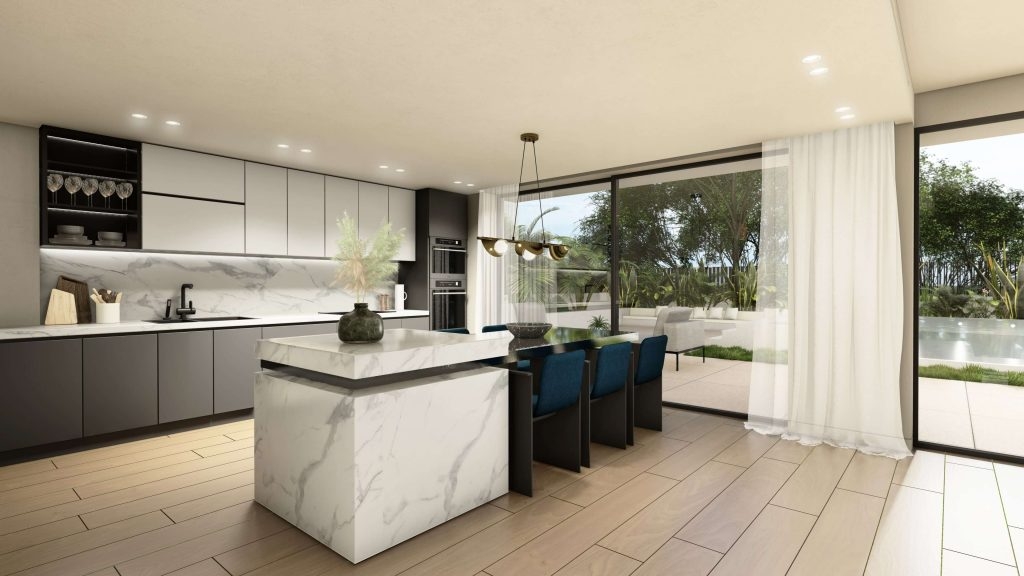 Αυτή η πολυτελής μεζονέτα, ξεχωρίζει όχι μόνο, για τη λειτουργικότητα αλλά και για τον σύγχρονο σχεδιασμό της. Είναι τριών επιπέδων με συνολική επιφάνεια 174 τ.μ. Στο ισόγειο υπάρχουν άνετοι χώροι υποδοχής με το σαλόνι, η τραπεζαρία, η κουζίνα και ένα W.C. Επίσης, υπάρχει άμεση πρόσβαση στον ιδιωτικό κήπο των 262 τ.μ. και στην πισίνα 30 τ.μ.