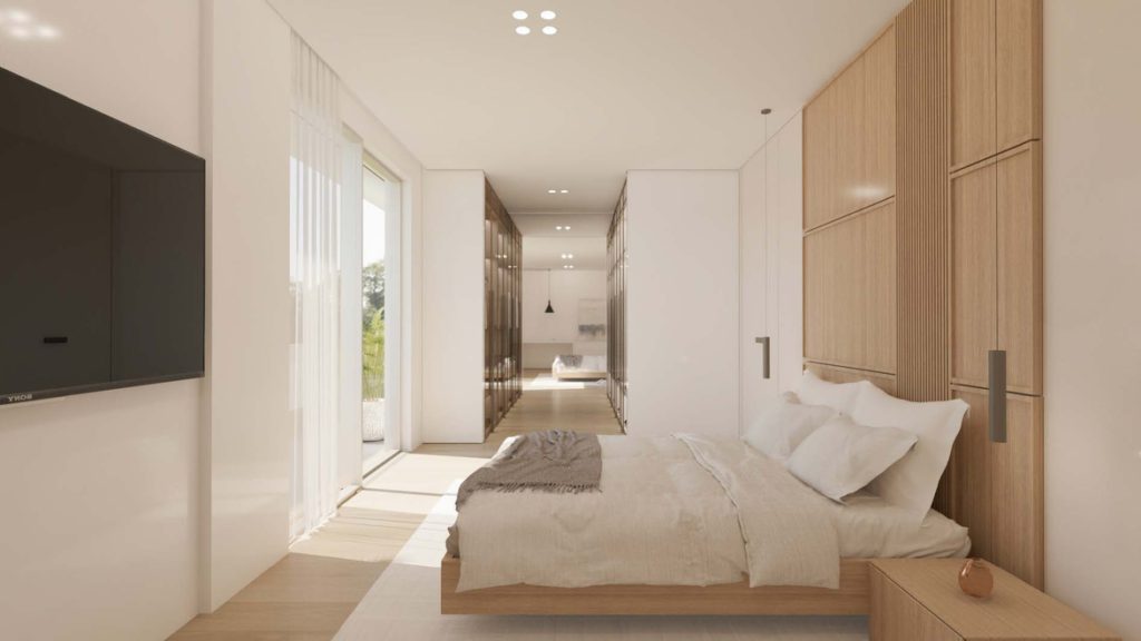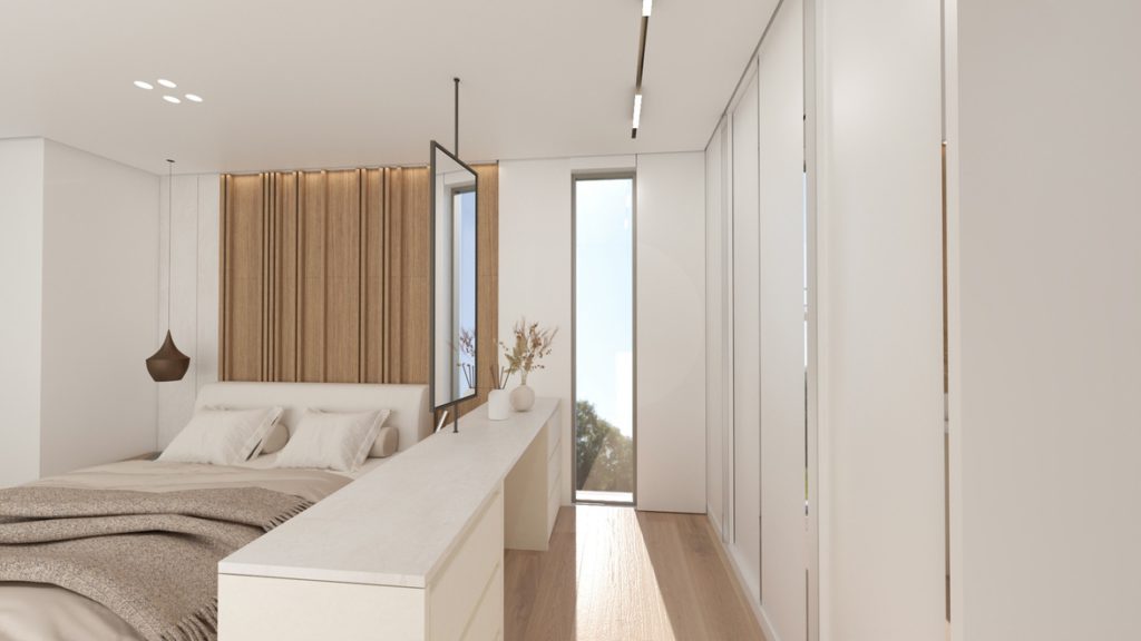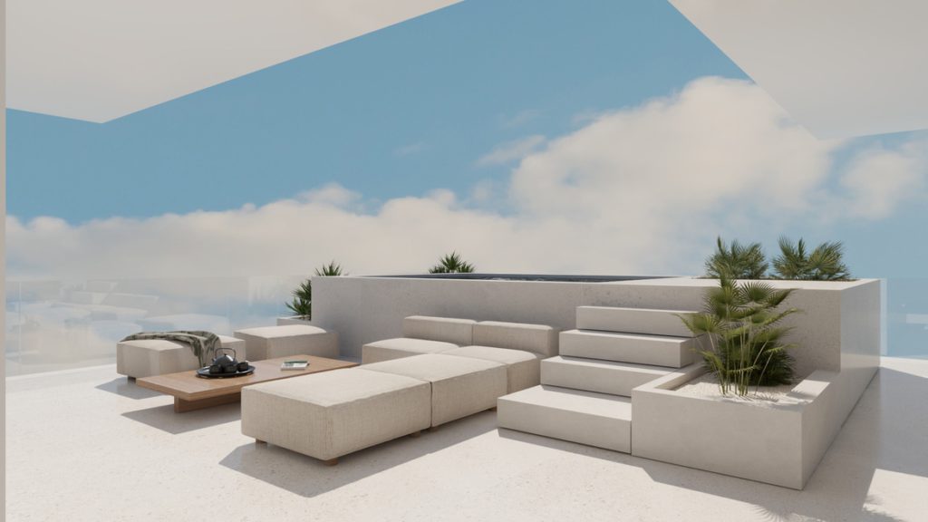 Το δεύτερο επίπεδο φιλοξενεί δύο ακόμη master υπνοδωμάτια, όλα με δικά τους μπάνια, καθώς και έναν επιπλέον lounge χώρο με μικρή κουζίνα, ιδανικό για στιγμές χαλάρωσης ή φιλοξενίας. Από τον ίδιο χώρο υπάρχει άμεση πρόσβαση στην ιδιωτική πισίνα, η οποία προσφέρει μαγευτική θέα προς τη θάλασσα και μια ξεχωριστή εμπειρία διαβίωσης.