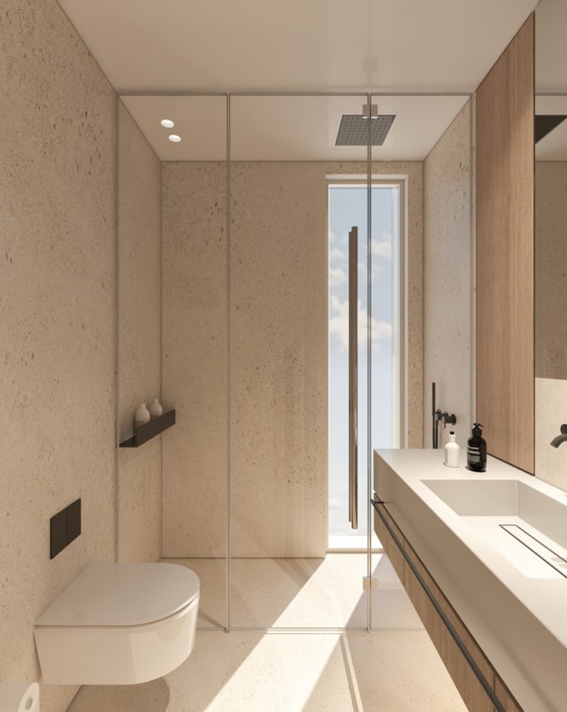Στο πρώτο επίπεδο, η κατοικία έχει ενιαία διαρρύθμιση. Υπάρχουν άνετοι χώροι υποδοχής, μια κομψή κουζίνα, τραπεζαρία και ευρύχωρο καθιστικό, με μεγάλες ανοιγόμενες επιφάνειες που εξασφαλίζουν φυσικό φως και απρόσκοπτη θέα. Επιπλέον, υπάρχει WC επισκεπτών. Επίσης υπάρχει λειτουργικός χώρος πλυντηρίου, χώρος γραφείου και ένα master υπνοδωμάτιο με ιδιωτικό μπάνιο.