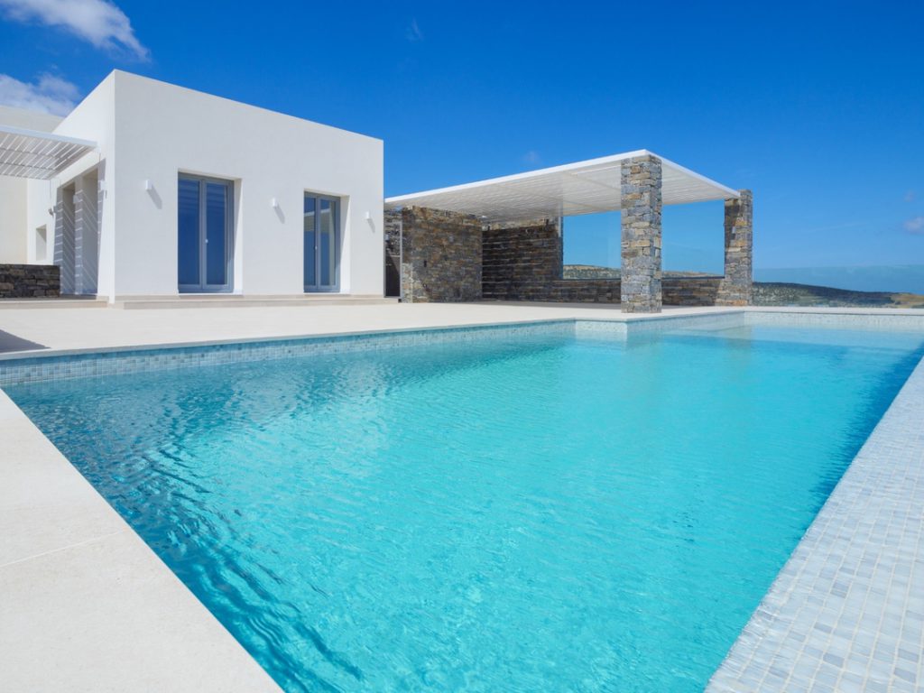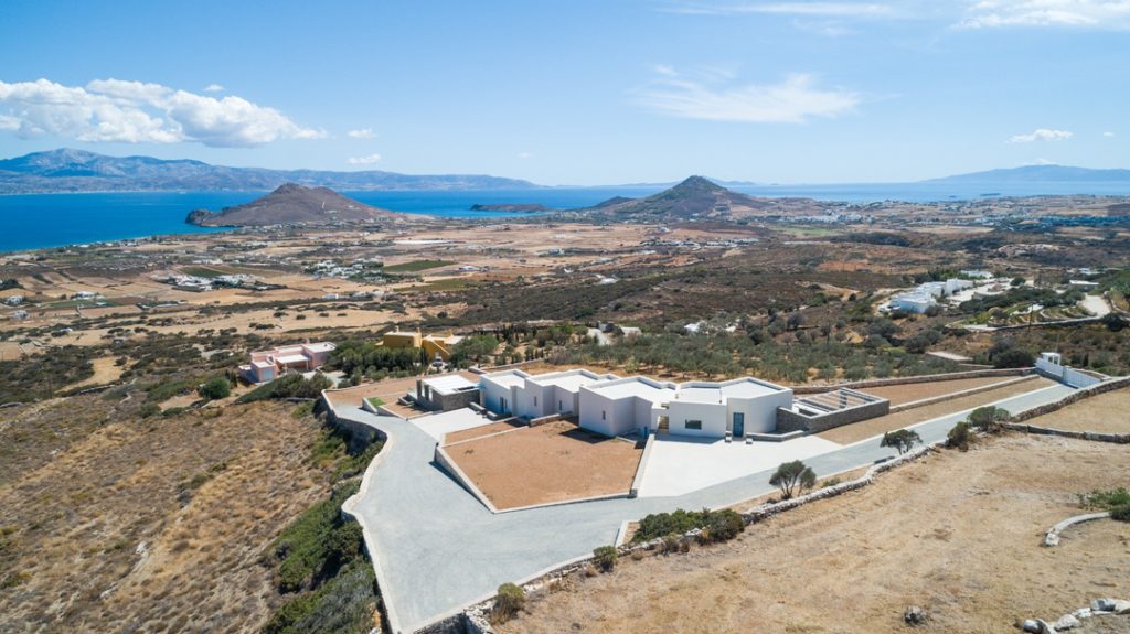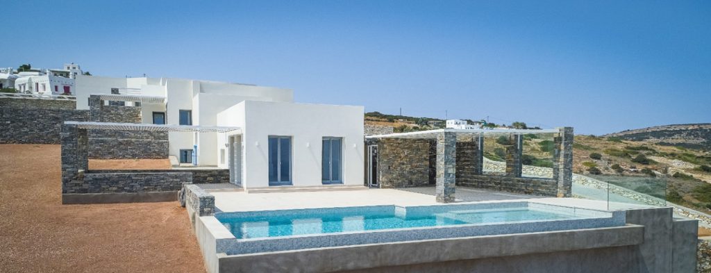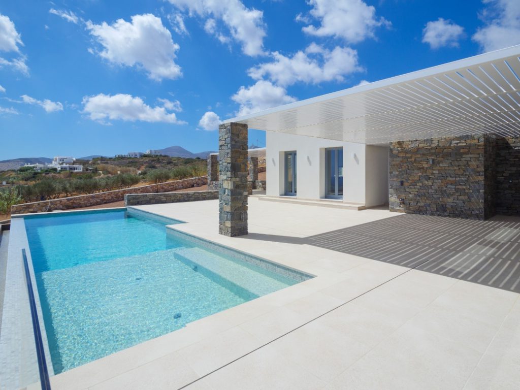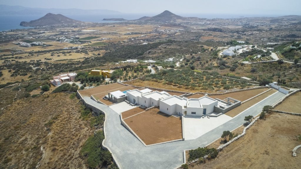 Ο εξωτερικός χώρος περιβάλλεται από προσεγμένα διαμορφωμένους κήπους και κορυφώνεται από την ιδιωτική πισίνα, ένα ιδανικό καταφύγιο χαλάρωσης κάτω από τον αιγαιοπελαγίτικο ήλιο. Από εδώ οι θέες αγκαλιάζουν το νησί και προσφέρουν στιγμές αυθεντικής γαλήνης.
